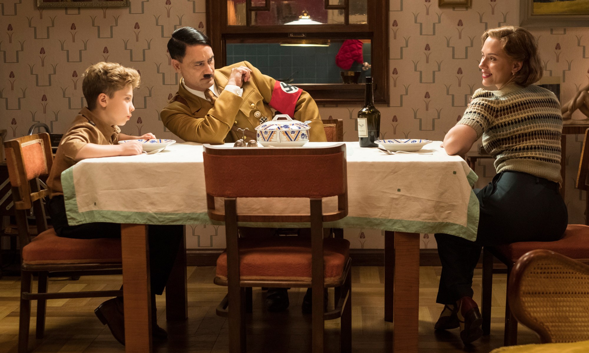 Waititi, the actor, mirrors Chaplin by lampooning Hitler’s decisions and imitating his manner of speech. All the silliness you’d expect from a ten year-old is there, along with biting jokes for those geopolitically inclined. On a different level, Waititi, the director, channels Life is Beautiful by showing us a world three feet high instead of six. Jojo Rabbit is a coming-of-age tale, with adults tugging at the strings of his life behind some curtain of maturity. These adults are sometimes imbeciles (low-level Nazi soldiers), sometimes courageous (Jojo’s mother, portrayed by Scarlett Johannson), and sometimes both depending on the situation (washed up Captain Klenzendorf, portrayed by Sam Rockwell). They operate formally in the adult realm, which inexorably approaches and darkens Jojo’s world throughout the film, but Waititi, the screenwriter, manages to find great laughs in the childlike tendencies of even the Gestapo. This is not to say that the director makes fun of the culture of fear or terrible tragedy that infected Nazi Germany. He finds laughs in both dark and lighter moments by exposing the ridiculousness of Nazism.